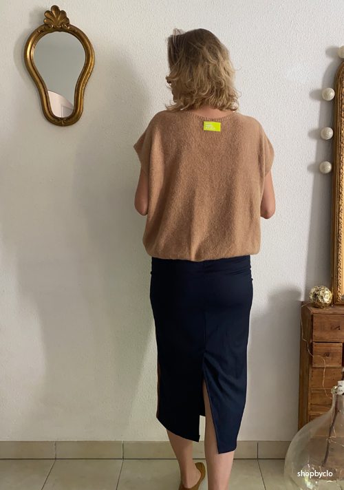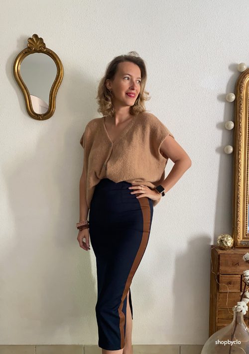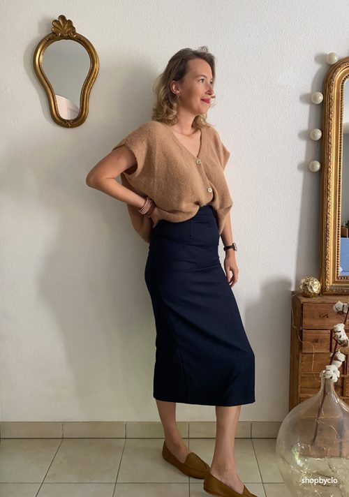 • Je porte la jupe avec le gilet oversize Bridget en camel, pour faire un rappel avec la jupe.
