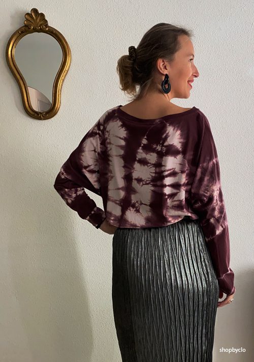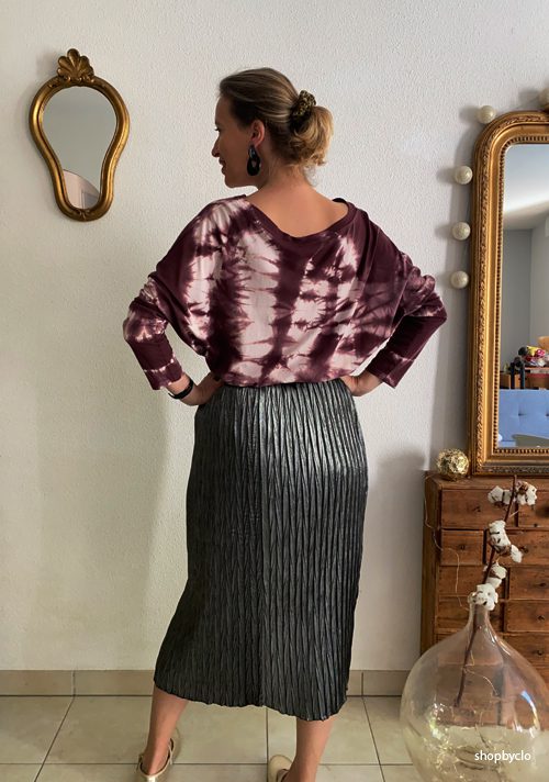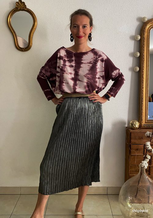Porter des vêtements qui brillent hors période de fêtes, c’est tout à fait possible. Je vous propose une version chic et facile à porter en journée, avec le t-shirt Biba tie en dye en prune.