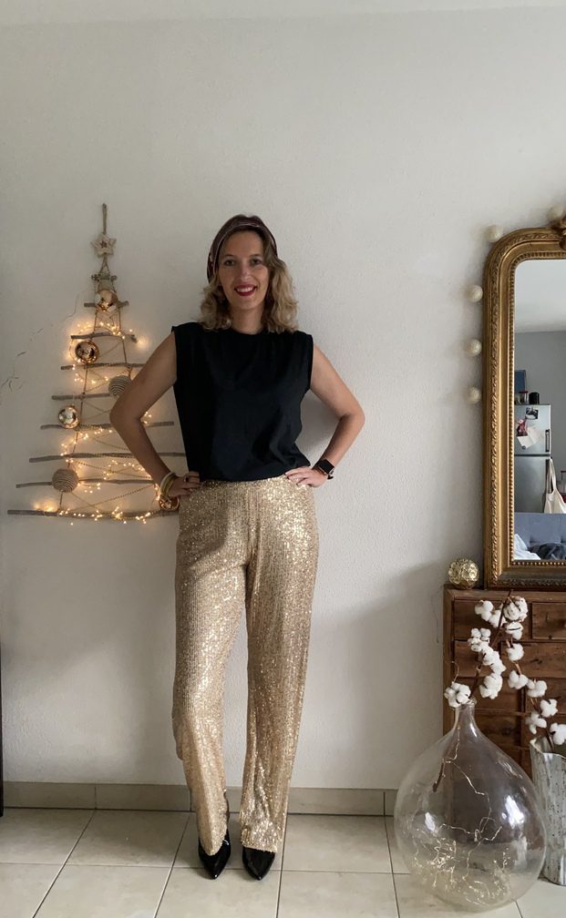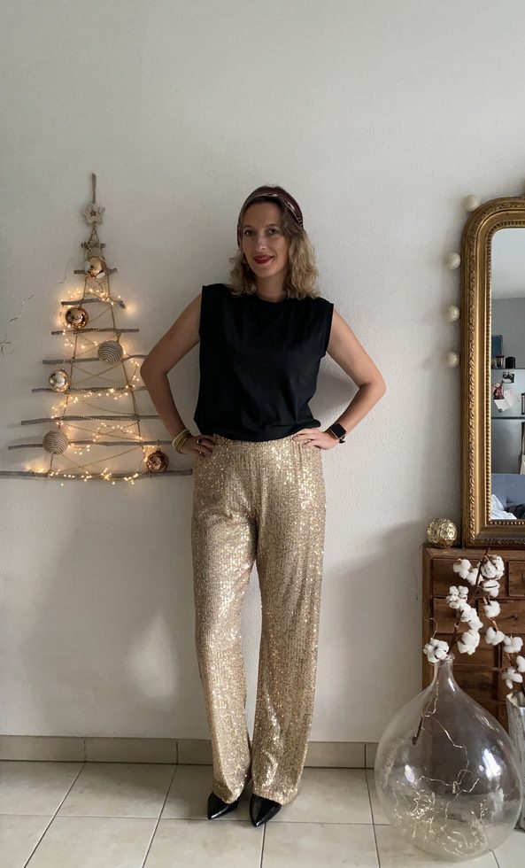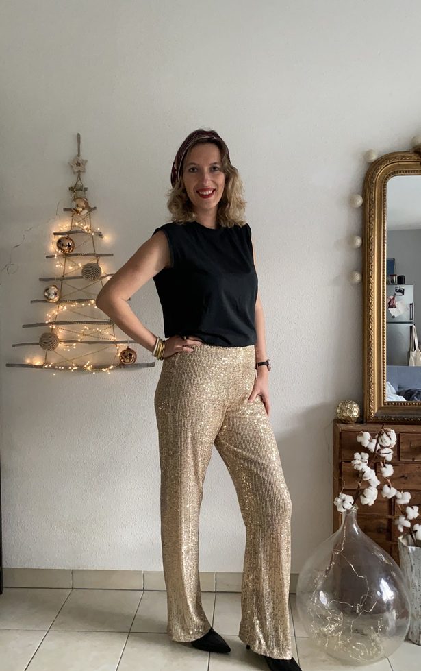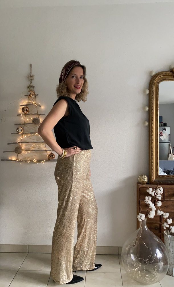 Entièrement recouvert de sequins dorés, ce pantalon est LA pièce festive par excellence. Sa coupe droite lui donne une allure chic, équilibrée et facile à porter. Il illumine la silhouette sans jamais alourdir.