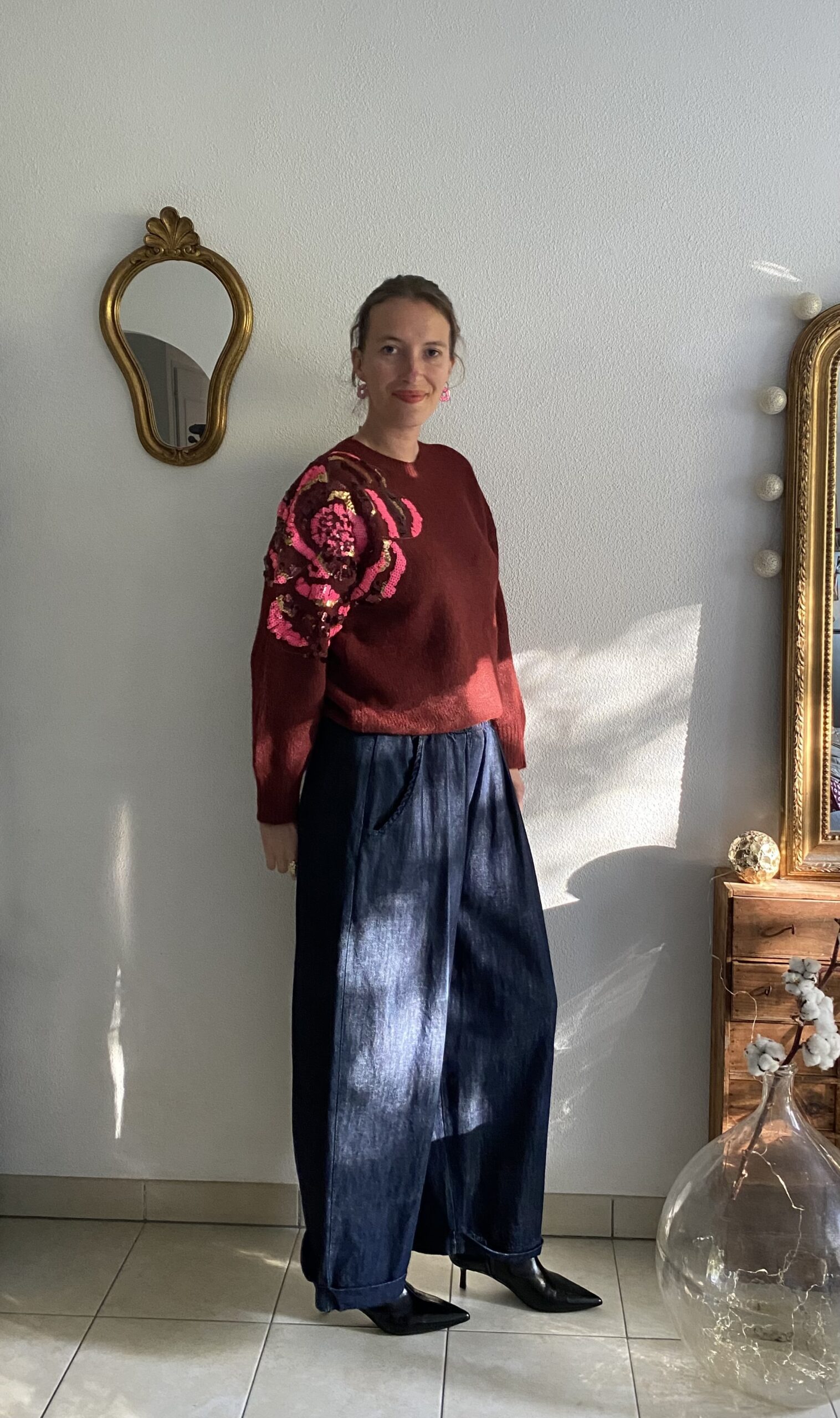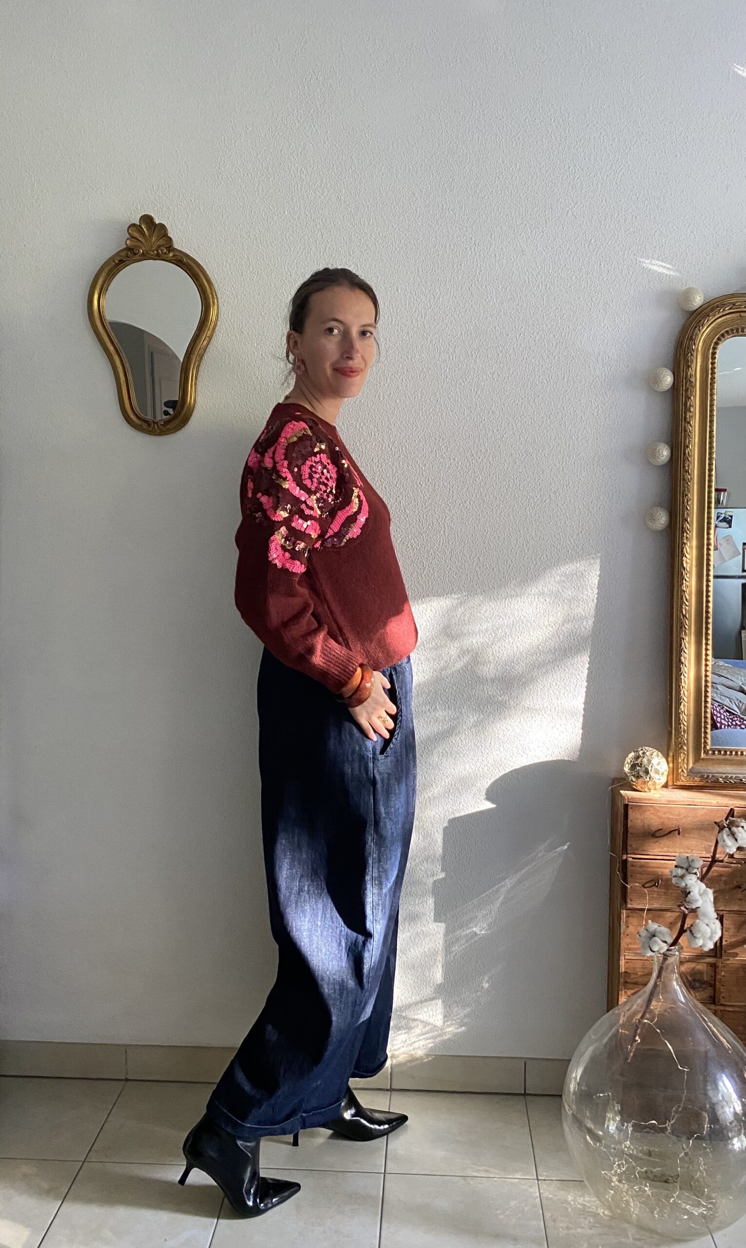 Un pull d’un beau bordeaux, réhausseur d’une fleur brodée de sequins rose fluo, et bordeaux sur l’épaule gauche. Un détail très couture et poétique.