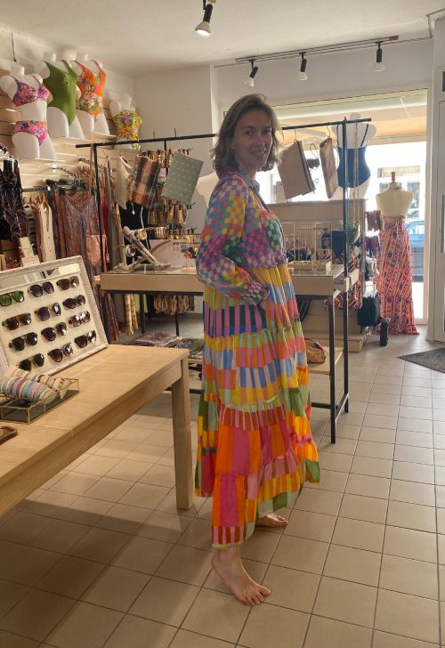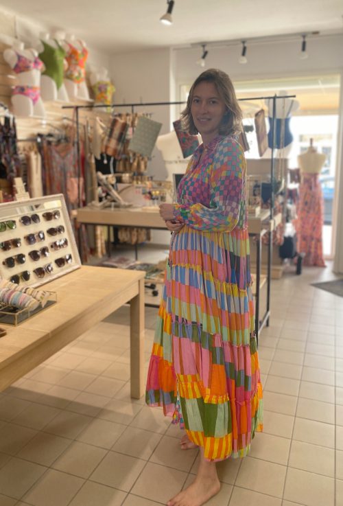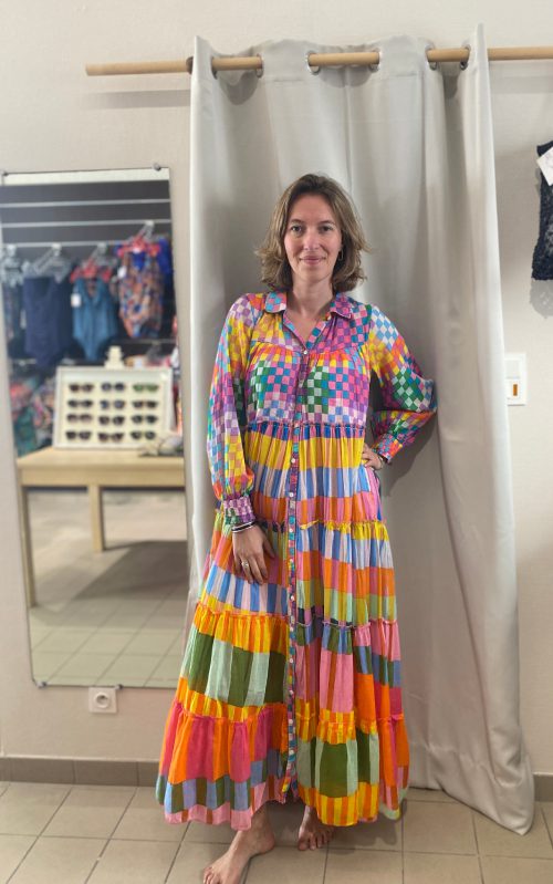 Coup de coeur pour cette magnifique robe longue colorée ! A manches longues, elle est doublée et non transparente.