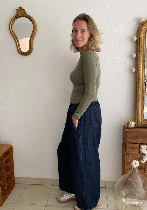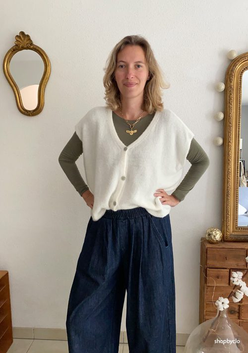- Disponible en kaki ou en écru col V dont la composition est la suivante (86% modal, 11% cachemire 3% elasthanne)
